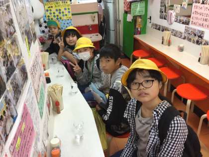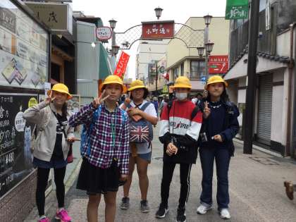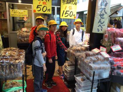 小町通りを散策しています。お昼ごはんを食べているグループもいます。