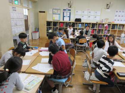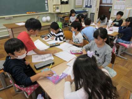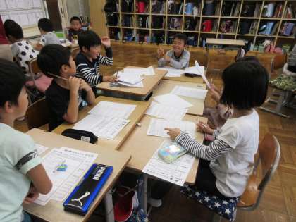 町たんけんに向けての計画を立てました。1組,2組で同じ場所を探検するグループ同士がが集まって,調べたいことや質問したいことなどを話し合って決めました。どのグループも意見を出し合いながら,一生懸命話し合いを行っていました。
