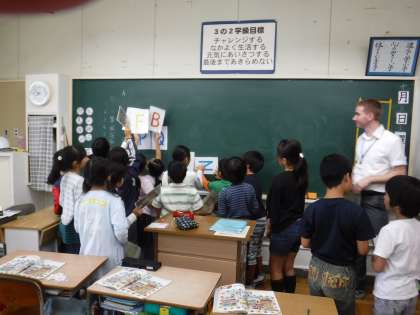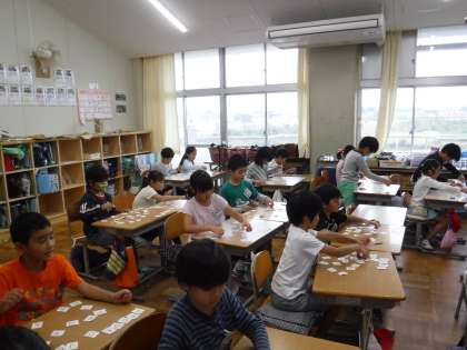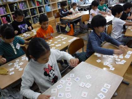 英語でアルファベットの学習が始まりました。アルファベット26文字を順番に並べたり,字形の共通点を探して仲間を見つけたり,ゲームで楽しみながら学習を進めています。