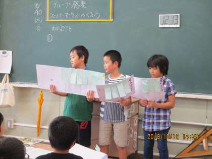 社会のスーパーマーケット見学で調べたこと、わかったことをグループごとにまとめ発表しました。お客さんのために、はたらく人のために、体の不自由な人のためになど様々な工夫に気がつきました。