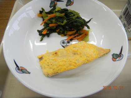 サケのモミジ焼きは,生サケににんじんをすり下ろしたものを混ぜたマヨネーズをのせて,オーブンで焼いたものです。たんぱくなサケににんじん味の付いたマヨネーズが味に濃厚さを出しており,大変おいしかったです。