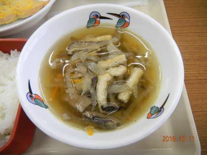 さわにわんは,季節の野菜のたくさん入った汁でした。キノコ(シイタケ,マイタケ)がたっぷり入っており,ダイコン,ニンジン,ゴボウなど根菜類もたくさん入っていて食べごたえのあるお汁です。