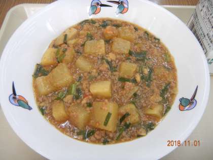 マーボだいこんは,とうふのかわりに,だいこんを使っています。だいこんの淡泊な味がマーボのたれにからんで大変おいしくなっています。本校は自校給食なので,調理師さんの手作りが自慢です。全校食で20キログラムのだいこんを,皮をむいてさいの目にして下ゆでしてから,マーボのたれにからめます。