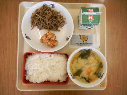 今日の献立は,ごはん,あじつけのり,とりのから揚げ,きんぴらゴボウ,とうにゅう汁でした。
