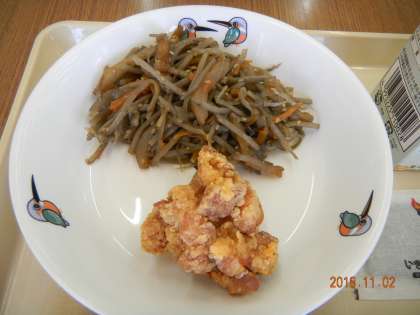 とりのから揚げは,本校の給食の人気ナンバー1のメニューです。切り分けられた鶏もも肉に,調理師さんたちが作ったオリジナルたれで下味をじっくりつけて,からっと揚げています。ころもはサクサク,中はジューシー,味はしっかり,とってもおいしいです。他のから揚げ大好きな職員も「お店で売れる味です」と絶賛しています。