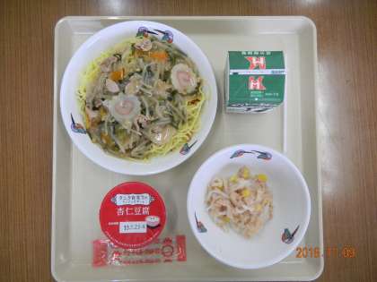 今日の献立は,五目あんかけ焼きそば,ツナとダイコンのサラダ,杏仁豆腐(アンニンドウフ)でした。