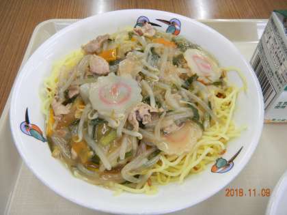 五目あんかけ焼きそばは,メンの上に具のたくさん入ったアンがたっぷりとかかっていてボリューム満点でした。調理師さんの一工夫によってメンに焼き目をつけて本格的なあんかけ焼きそばに仕上がっていました。大変おいしかったです。