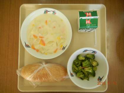 今日の献立は,きなこあげぱん,クリームシチュー,ブロッコリーのガーリックソテーでした。