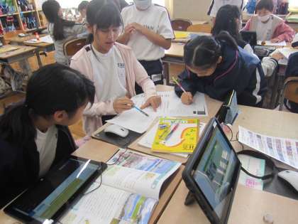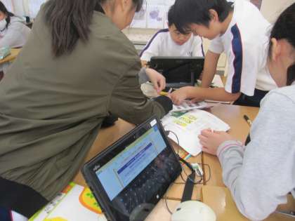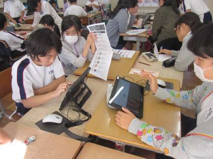 社会では,タブレットを活用して,食料生産についてのCMづくりの学習を行っています。「食料自給率を上げよう」や「和食を取りもどそう」などと,グループごとにテーマを決め,写真やBGMを選んで一つのCMを作っています。出来上がりがとても楽しみです。