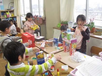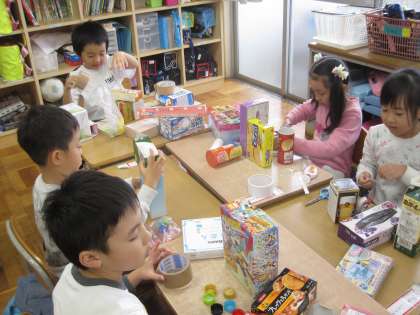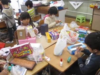 図工の時間に,箱を組み合わせて,作品を作りました。持ってきた箱を机に並べて「何を作ろうかな〜」と考えました。家を作ったり,動物を作ったりしてすてきな作品ができ上がりました。