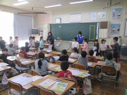 中学2年生が,教室に入って先生の仕事を体験しています。子供たちも,楽しく接しています。