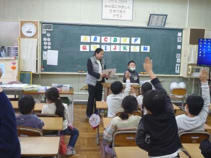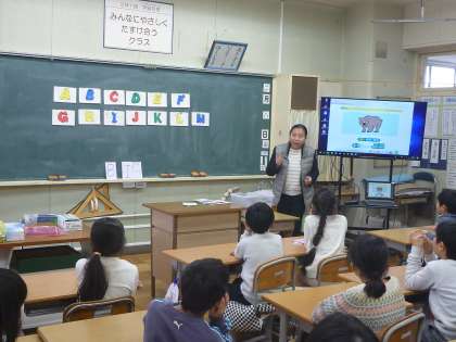 外国語活動が行われました。今回はA〜Mまでのアルファベットの読み方をみんなで発音したり,A〜Mのアルファベットで始まるものの名前や動物の名前などを発音したりしました。アルファベットを使ったゲームを取り入れながら,楽しく活動しました。