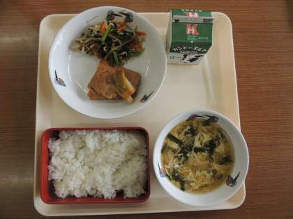 今日の献立は,ごはん,牛乳,鯖のみそ煮,のり酢和え,にらたま汁 です。