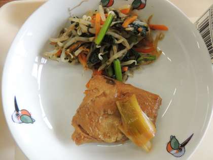 今日は,こまつなとにんじん,もやしを一緒に,のりで和えた「のり酢和え」になっています。のりの風味を味わっていただくことができました。