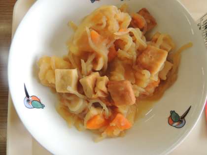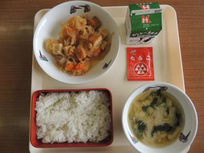 今日の献立は,麦ごはん,ふりかけ,牛乳,じゃがいもの旨煮,豆乳汁 です。