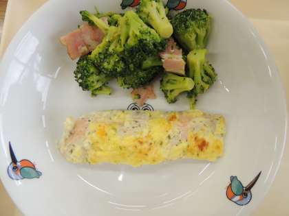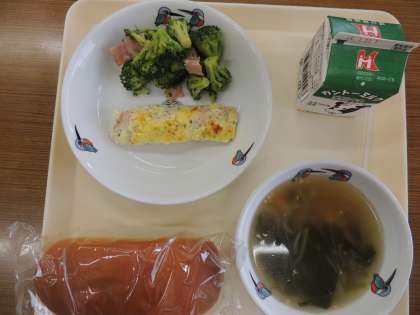 今日の献立は,ミルクパン,牛乳,鮭のコーンマヨ焼き,ブロッコリーのガーリックソテー,オニオンスープ です。
