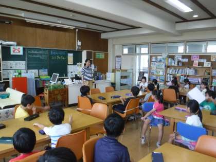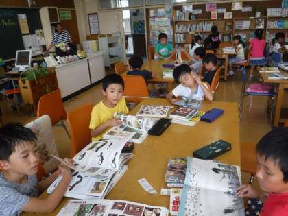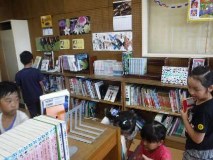 今日は夏休みに読む本の貸し出しがありました。夏らしい本をはじめ,自分の興味のあることや,挑戦してみたいことに関する本を探しています。
