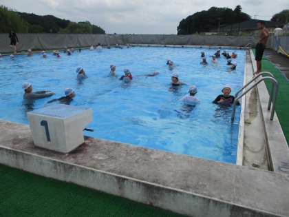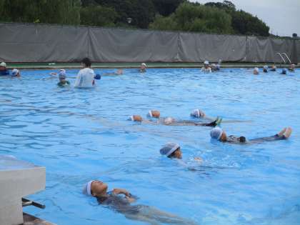 今日は着衣泳をしました。服を着たまま、水の中に入るとどのような感じがするのかを体験したり、浮きのとり方を練習したりしました。