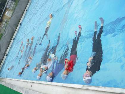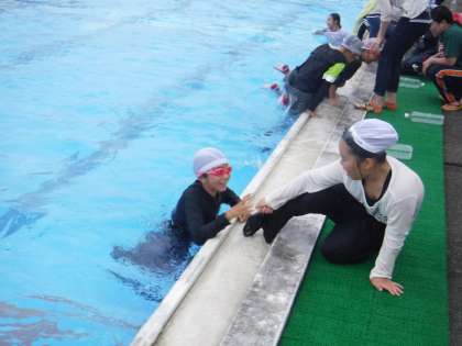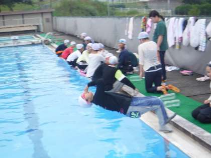 2時間目に着衣泳を行いました。万が一,水の中に落ちてしまった時の対処の仕方を確認しました。自分の服に空気を入れたりペットボトルを使ったりして,上手に浮くことができました。