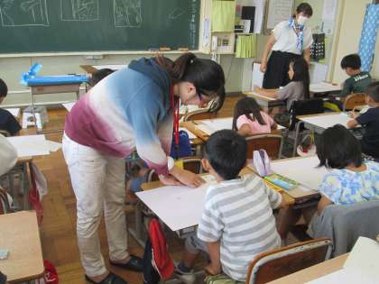 東京芸術大学から講師の先生をお迎えし、図工の授業を行いました。今日は3年生が指導を受けました。先生に描き方のヒントをもらい熱心に取り組んでいました。