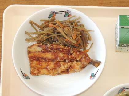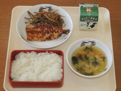 今日の献立は,ごはん,牛乳,いわしの蒲焼き,きんぴらごぼう,みそ汁 です。