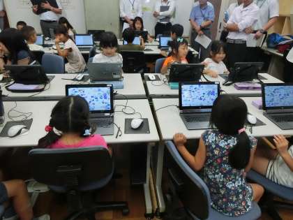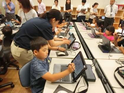 取手市の教員一斉研修で1年3組がプログラミング学習を公開しました。