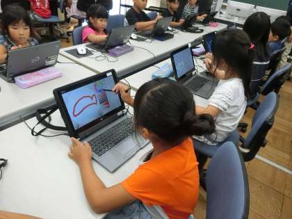 プログラミング教材のビスケットを使って、魚の絵を描きました。描いた魚を一つの画面にまとめて映し、賑やかな水族館ができて大歓声が上がりました。子供たちからは「コンピュータってこんなことができるんだ」「コンピュータって楽しい」という発言が聞かれ、楽しく学習することができました。