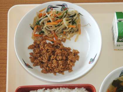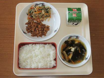 今日の献立は,ごはん,牛乳,ビビンバ,わかめスープ です。