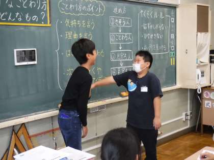 そこで,5年生では,望ましい人間関係づくりのために,「SST(ソーシャルスキルトレーニング」を行っています。今回は「上手な断り方」の学習です。相手も自分もいやな思いをしない断り方をするために,以下のポイントをもとに互いにロールプレイングをしました。