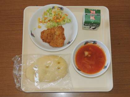 今日の献立は,フォカッチャ,牛乳,チキンバジルフライ,キャベツとコーンのサラダ,トマトスープです。