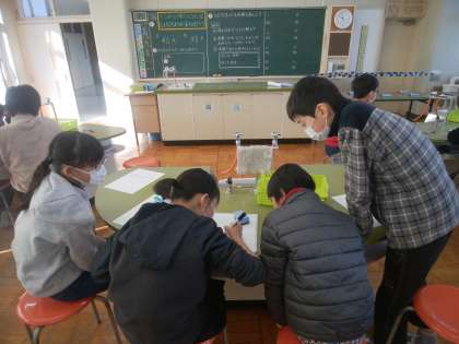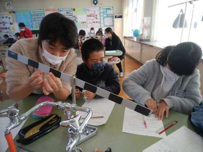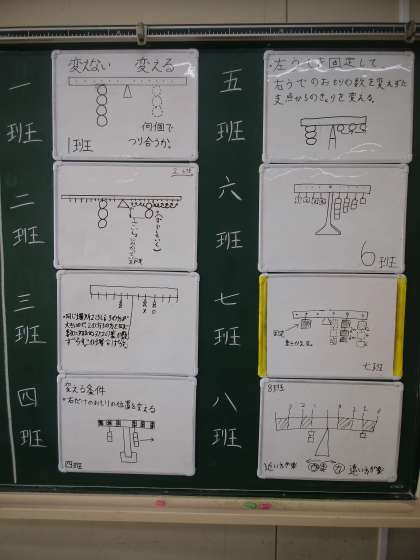 今日の理科は、てこの学習を行いました。てこは、どんな条件のときにつり合うのか児童自ら実験方法を考え、探究活動に取り組みみます。試行錯誤をくり返し、友達との意見交流を通して、次第にきまりに気付くことができたようです。一見複雑に見える現象を、簡単な式で表すことのできる科学の美しさを感じることができました。