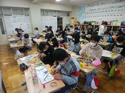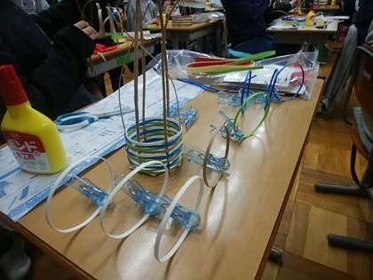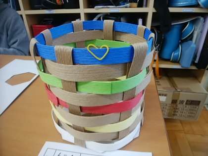 今日の図工は、アミアミアミーゴです。板状の紙を編んでペン立てやバスケットを制作します。飾り付けにも工夫を凝らして、かわいい作品がたくさんできました。