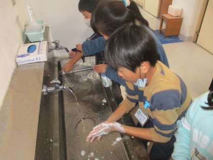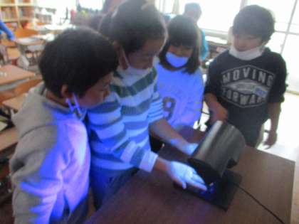 保健室からテスターを借りてきて実験です。普段よりよーく手を洗って、さてきれいになったかなと光を当ててみると、なんと洗い残しがいっぱい!