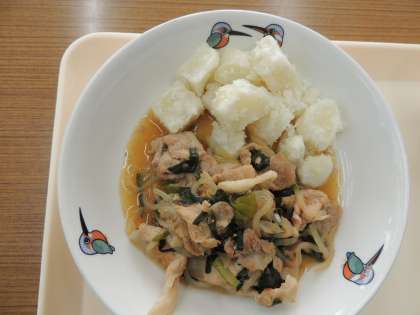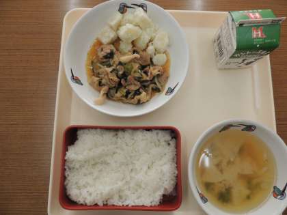 今日の献立は,ごはん,牛乳,豚肉としらたきのピリ辛炒め,粉ふきいも,みそ汁 です。