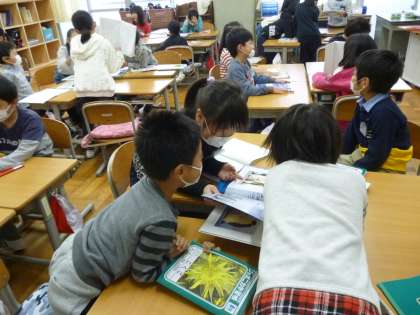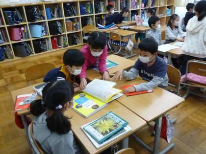 国語の時間に動物の本を読み,分かったことをもとにして,動物クイズを作りました。作ったクイズを友達と出し合ったり,クラスのみんなの前で発表したりして,楽しく活動できました。クイズにはただ答えるだけでなく,実際にクイズ作成に使った本から,その根拠となる箇所を探しました。
