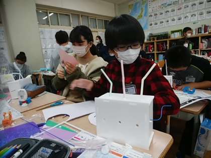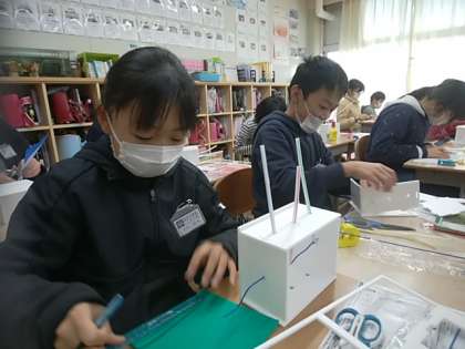今日の図工は、「クルクルクランク」の制作です。針金のハンドルを回すと、ストローが往復運動をするクランクを作りました。ストローの往復運動を、どのような動きに生かすか構想をふくらませました。