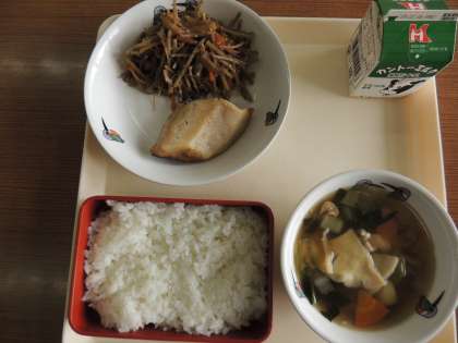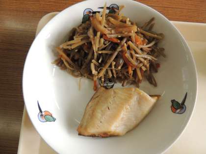 今日の献立は,ごはん,牛乳,ほっけの塩焼き,きんぴらごぼう,せんべい汁 です。
