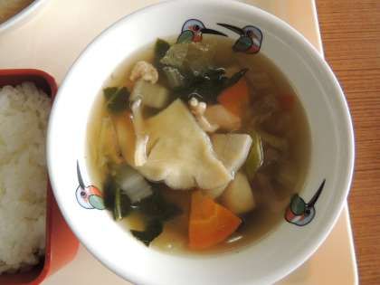 せんべい汁は,八戸という町を中心とした南部地方に伝わる料理です。南部せんべいは,小麦粉と塩で作ります。だしをすって,モチモチとおいしくなった「せんべい」を食べて,あたたまりましょう。