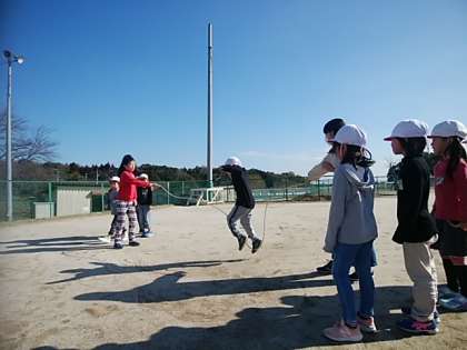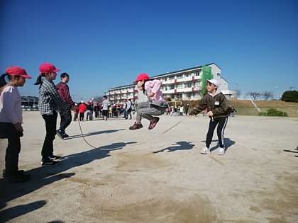 今日の業間休みは、なわとびタイムです。全校児童で8の字跳びの練習をしました。6年生は、3チームに分かれて1年生に8の字跳びのコツを教えました。