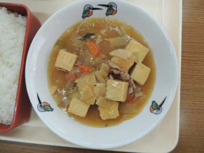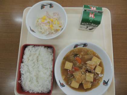 今日の献立は,麦ごはん,牛乳,生揚げの中華煮,ハムと大根のサラダ です。
