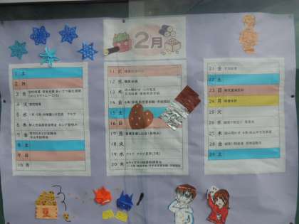 広報委員会が,校舎階段前の掲示コーナーに毎月の行事予定表を作成し,提示しています。季節にあった掲示を工夫し,子供たちの目を楽しませてくれています。