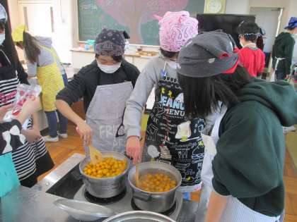 今日は,午後から6年生の授業参観が開催されます。それにあわせて,保護者の方々にごちそうするデザートづくりを行いました。6年間の感謝を込めて一生懸命作りました。作っている様子をスライドショーにて披露するため,編集作業も児童が行っています。午後からの授業参観を楽しみにしてご来校ください。