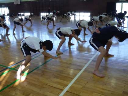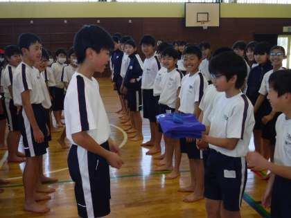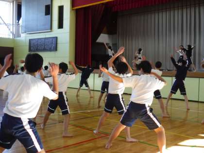 次年度に向けて,6年生からソーラン節を教えてもらいました。6年生のお手本を真似しながら,構えの姿勢や声出しのポイントなどを覚えました。6年生がとても熱心に教えてくれたので,大体踊れるようになった児童もおり,この伝統を受け継いでいこうとする気持ちが芽生えたようです。