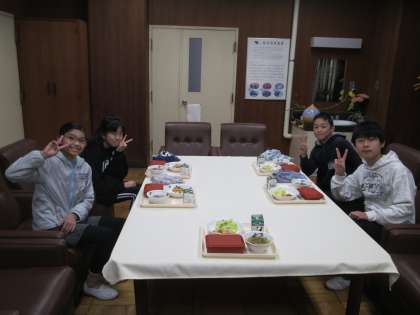 校長室招待給食が行われています。卒業を控えた6年生と1日4人ずつ、6年間の思い出や中学校に進学してからの目標などを話しながら会食しています。話を聞いていると、6年間で大きく成長した様子が感じられます。