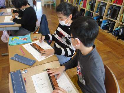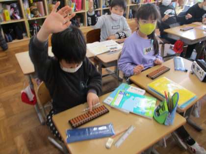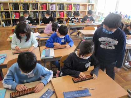 2/27 3年 楽しいそろばん 公開日 2020/02/27 更新日 2020/02/27 3年生の様子 2月27日(木) 算数でそろばんの学習に入りました。初めてそろばんを扱うという子がほとんどで、そろばんの仕組みや取り扱い方、玉の意味や置き方、払い方などの練習をしました。 簡単なたし算やひき算の計算をして、「おもしろい」「そろばん楽しい!」とそろばん学習に意欲満々でした。