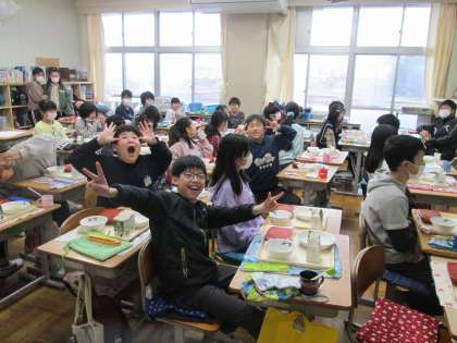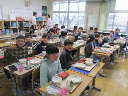 4年生と5年生の給食の様子です。インフルエンザ対策で、グループではなく前向き給食になっています。早くグループで食べる給食に戻りたいです。