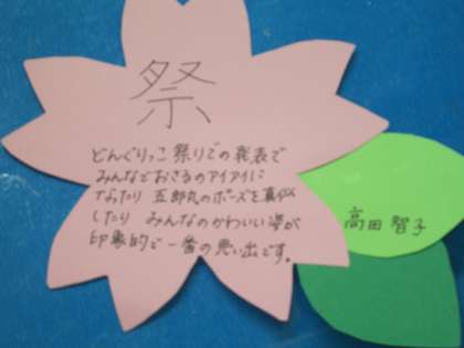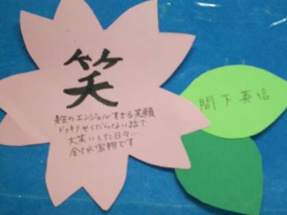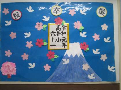 図書室前に掲示してある6年生へのメッセージボードです。先生方からのメッセージが掲示されています。卒業までに満開の桜になるはずでした。