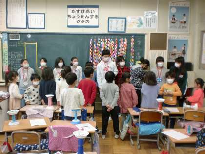 1年間,様々な場面で優しく教えてくれたり,助けてくれた6年生のみなさんに,感謝の気持ちを込めて,手作りのメダルをプレゼントしました。6年生のみなさん,お世話になりました。ありがとうございました。