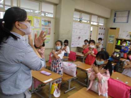 外国語活動の時間には,英語のじゃんけんを教わりました。「Rock-Paper-Scissors(ロック・ペーパー・シザーズ)1,2,3」の言い方をしっかり覚えました。英語を使って「じゃんけん列車」を楽しみ,おおいに盛り上がりました。