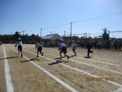 今日は,青空の下,運動会が行われました。はじめの種目は,「かけっこごーごー」,徒競走です。みんな,精一杯の力強い走りを見せてくれました。応援,ありがとうござへいました。